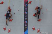 Atlet panjat tebing Indonesia Veddriq Leonardo melakukan selebrasi usai menang pada babak final speed putra ajang panjat tebing Asian Championships 2019 di Stadion Pakansari, Bogor, Jawa Barat, Sabtu (9/11/2019). Veddriq berhasil menjadi yang tercepat mengalahkan atlet panjat tebing Indonesia Kiromal Katibin, dengan menorehkan catatan waktu 5,406 detik, sedangkan Kiromal Katibin 5,547 detik. ANTARA FOTO/Hendra Nurdiyansyah/aww.