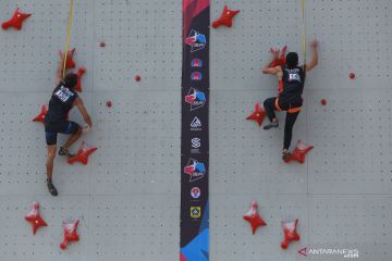 Atlet panjat tebing Indonesia Veddriq Leonardo (kanan) beradu cepat dengan Kiromal Katibin (kiri) pada babak final speed putra ajang panjat tebing Asian Championships 2019 di Stadion Pakansari, Bogor, Jawa Barat, Sabtu (9/11/2019). Veddriq berhasil menjadi yang tercepat mengalahkan atlet panjat tebing Indonesia Kiromal Katibin, dengan menorehkan catatan waktu 5,406 detik, sedangkan Kiromal Katibin 5,547 detik. ANTARA FOTO/Hendra Nurdiyansyah/aww.