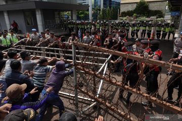 Warga Desa Slarang, berusaha merobohkan barikade kawat berduri saat melakukan unjuk rasa menuntut realisasi janji penanganan limbah batubara, kepada PT. Sumber Segara Primadaya selaku pengelola PLTU di Desa, Karangkandri, Kesugihan, Cilacap, Jateng, Kamis (14/11/2019). Warga menuntut pemindahan saluran pembuangan limbah B3 PLTU, yang berdekatan dengan rumah warga, karena memicu sejumlah penyakit infeksi saluran pernafasan terhadap anak-anak serta orang dewasa, dan menyebabkan kerusakan lingkungan yang berdampak pada penurunan hasil panen warga. ANTARA FOTO/Idhad Zakaria/pras.