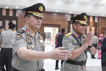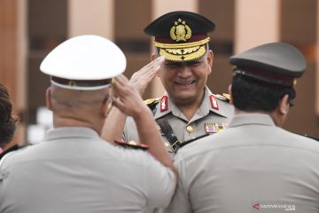 Kabarhakam Polri Irjen Pol Firly Bahuri (kanan) didampingi Kadiv Humas Polri Irjen Pol M Iqbal (kiri) menerima ucapan selamat dari rekannya seusai serah terima jabatan pejabat tinggi Polri di Gedung Bareskrim Polri, Jakarta, Selasa (19/11/2019). Berdasarkan surat telegram rahasia bernomor ST/3020/XI/KEP/2019 Polri merotasi jabatan tujuh perwira tinggi yakni Komjen Pol Condro Kirono menjabat Analis Kebijakan Utama Baharkam, Irjen Pol Firly Bahuri menjabat Kabarhakam Polri, Irjen Pol Priyo Widyanto menjabat Kapolda Sumatera Selatan, Irjen Pol Muktiono menjabat Kapolda Kalimantan Timur, Irjen Pol Refdi Andri menjabat Koorsahli Kapolri, Brigjen Pol Istiono menjabat Kakorlantas Polri dan Brigjen Pol Anang Syarif Hidayat menjabat Kapolda Kepulauan Bangka Belitung. ANTARA FOTO/Hafidz Mubarak A/hp.