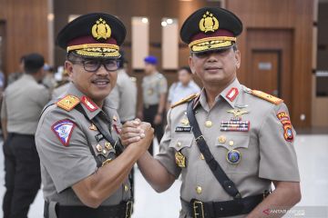 Kabarhakam Polri Irjen Pol Firly Bahuri (kanan) menerima ucapan selamat dari rekannya seusai serah terima jabatan pejabat tinggi Polri di Gedung Bareskrim Polri, Jakarta, Selasa (19/11/2019). Berdasarkan surat telegram rahasia bernomor ST/3020/XI/KEP/2019 Polri merotasi jabatan tujuh perwira tinggi yakni Komjen Pol Condro Kirono menjabat Analis Kebijakan Utama Baharkam, Irjen Pol Firly Bahuri menjabat Kabarhakam Polri, Irjen Pol Priyo Widyanto menjabat Kapolda Sumatera Selatan, Irjen Pol Muktiono menjabat Kapolda Kalimantan Timur, Irjen Pol Refdi Andri menjabat Koorsahli Kapolri, Brigjen Pol Istiono menjabat Kakorlantas Polri dan Brigjen Pol Anang Syarif Hidayat menjabat Kapolda Kepulauan Bangka Belitung. ANTARA FOTO/Hafidz Mubarak A/hp.