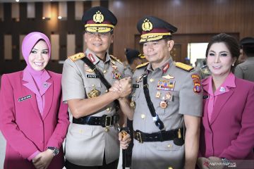 Kapolda Sumatera Selatan Irjen Pol Priyo Widyanto (kedua kiri) didampingi istri berjabat tangan dengan Kapolda Kalimantan Timur Irjen Pol Muktiono (kedua kanan) didampingi istri seusai serah terima jabatan pejabat tinggi Polri di Gedung Bareskrim Polri, Jakarta, Selasa (19/11/2019). Berdasarkan surat telegram rahasia bernomor ST/3020/XI/KEP/2019 Polri merotasi jabatan tujuh perwira tinggi yakni Komjen Pol Condro Kirono menjabat Analis Kebijakan Utama Baharkam, Irjen Pol Firly Bahuri menjabat Kabarhakam Polri, Irjen Pol Priyo Widyanto menjabat Kapolda Sumatera Selatan, Irjen Pol Muktiono menjabat Kapolda Kalimantan Timur, Irjen Pol Refdi Andri menjabat Koorsahli Kapolri, Brigjen Pol Istiono menjabat Kakorlantas Polri dan Brigjen Pol Anang Syarif Hidayat menjabat Kapolda Kepulauan Bangka Belitung. ANTARA FOTO/Hafidz Mubarak A/hp.