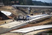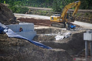 Pekerja menggarap proyek Tol Serang - Panimbang di Kampung Landak, Cikeusal, Serang, Banten, Selasa (19/11/2019). Pembangunan Tol Serang Panimbang saat ini diprioritaskan untuk penyelesaian Ruas Serang-Rangkasbitung sepanjang 27 kilometer yang ditargetkan selesai awal 2020. ANTARA FOTO/Asep Fathulrahman/foc.