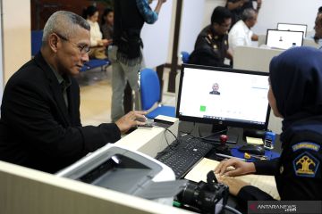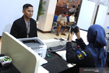 Dandim 1611/Badung Kolonel Inf Puguh Binawanto (kiri) mengikuti perekaman biometrik Paspor Elektronik (e-passport) saat penerbitan Paspor Elektronik perdana di Kantor Imigrasi Kelas I Khusus Ngurah Rai, Badung, Bali, Rabu (20/11/2019). Kantor Imigrasi Kelas I Khusus Ngurah Rai, mulai menerbitkan paspor elektronik 48 halaman dengan biaya Rp650 ribu. ANTARA FOTO/Fikri Yusuf/hp.