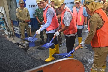 Wakil Walikota Cilegon Ratu Ati Marliati (kanan) bersama Vice President Corporate Affairs PT Chandra Asri Petrochemical Tbk (CAP) Suhat Miyarso (tengah) dan General Manager of Polymers Technical Service and Product Development CAP Edi Rivai (ketiga kanan) secara simbolis menuangkan bahan campuran aspal saat Peresmian Jalan Aspal Dengan Campuran Sampah Kantung Plastik di Cilegon, Banten, Senin (25/11/2019). Dalam pengerjaan jalan aspal sepanjang 19 kilometer yang tersebar di 19 titik itu, CAP mendukung Pemerintah Kota Cilegon dengan menyediakan 16,5 ton sampah kantung plastik tipe High Density Polyethylene (HDPE) atau sebesar 5-6 persen untuk campuran aspal sebagai salah satu solusi dalam mengelola sampah plastik. ANTARA FOTO/Asep Fathulrahman/hp.