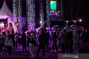 Sejumlah penonton antusias berpayung saat menikmati pertunjukan musik di International Jatiluhur Jazz Festival (IJJF) 2019, Waduk Jatiluhur, Purwakarta, Jawa Barat, Sabtu (30/11/2019). International Jatiluhur Jazz Festival 2019 merupakan program unggulan Jasa Tirta II untuk mempromosikan pariwisata melalui musik sekaligus meningkatkan kepedulian terhadap lingkungan. ANTARA/Kahfi Kamaru/aa.