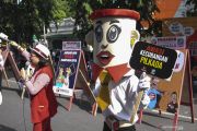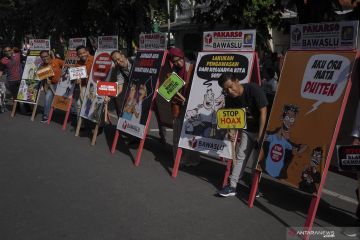 Anggota Badan Pengawas Pemilu (Bawaslu) Solo bersama Paguyuban Kartunis Solo melakukan sosialisasi pengawasan partisipatif saat kegiatan Hari Bebas Kendaraan Bermotor atau Car Free Day (CFD) Solo, Jawa Tengah, Minggu (1/12/2019). Sosialisasi pengawasan partisipatif tersebut berisi tentang pesan-pesan pemilu anti politik uang, anti hoax dan kecurangan dengan politisasi Suku Agama Ras dan Antargolongan (SARA) guna menyukseskan Pilkada 2020. ANTARA FOTO/Maulana Surya/aww.