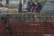 Tim Tacktikal Polairud Polda Riau memanjat kapal yang dibajak perompak dalam simulasi penanganan kejahatan di laut saat perayaan Hut Polairud ke-69 di Pekanbaru, Riau, Rabu (4/12/2019). Untuk memeriahkan Hut Polairud ke-69 Dit Polairud Polda Riau menampilkan beberapa aksi pertunjukan penanganan kejahatan lewat jalur air dan udara, serta kegiatan sosial diantaranya pengobatan gratis untuk masyarakat, donor darah, membersihkan tempat ibadah, sekolah dan pasar. ANTARA FOTO/Rony Muharrman/hp.