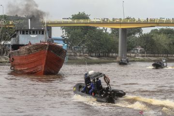 Tim Tacktikal Polairud Polda Riau mengejar kapal yang dibajak perompak dalam simulasi penanganan kejahatan di laut saat perayaan Hut Polairud ke-69 di Pekanbaru, Riau, Rabu (4/12/2019). Untuk memeriahkan Hut Polairud ke-69 Dit Polairud Polda Riau menampilkan beberapa aksi pertunjukan penanganan kejahatan lewat jalur air dan udara, serta kegiatan sosial diantaranya pengobatan gratis untuk masyarakat, donor darah, membersihkan tempat ibadah, sekolah dan pasar. ANTARA FOTO/Rony Muharrman/hp.