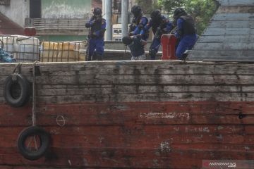 Tim Tacktikal Polairud Polda Riau berhasil mengambil alih kapal yang dibajak perompak dalam simulasi penanganan kejahatan di laut saat perayaan Hut Polairud ke-69 di Pekanbaru, Riau, Rabu (4/12/2019). Untuk memeriahkan Hut Polairud ke-69 Dit Polairud Polda Riau menampilkan beberapa aksi pertunjukan penanganan kejahatan lewat jalur air dan udara, serta kegiatan sosial diantaranya pengobatan gratis untuk masyarakat, donor darah, membersihkan tempat ibadah, sekolah dan pasar. ANTARA FOTO/Rony Muharrman/hp.