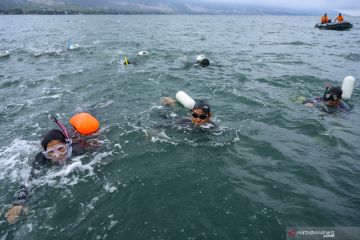 Sejumlah peserta berusaha saling mendahului pada renang lintas Teluk Palu, Sulawesi Tengah, Minggu (8/12/2019). Renang Lintas Teluk Palu yang diprakarsai Palu Swimming Club (PSC) berjarak enam kilometer itu selain untuk melatih kemampuan para perenang, sekaligus sebagai trauma healing atas suasana kejiwaan pascabencana tsunami tahun lalu yang terjadi di tempat itu. ANTARA FOTO/Basri Marzuki/ama.