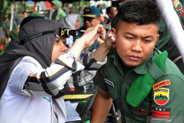 Seorang dokter memeriksa telinga prajurit TNI AD ketika mengikuti pengobatan gratis dan bakti sosial di Lapangan Benteng Medan, Sumatera Utara, Selasa (10/12/2019). Kegiatan pengobatan gratis dan bakti sosial itu digelar Kodam I Bukit Barisan dalam rangka menyambut Hari Juang Kartika TNI AD yang diperingati setiap tanggal 15 Desember. ANTARA FOTO/Septianda Perdana/hp.