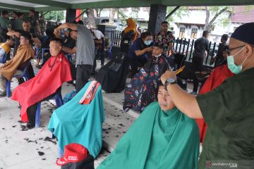 Sejumlah prajurit dan warga mengikuti cukur massal di Lapangan Benteng Medan, Sumatera Utara, Selasa (10/12/2019). Kegiatan pengobatan gratis dan bakti sosial itu digelar Kodam I Bukit Barisan dalam rangka menyambut Hari Juang Kartika TNI AD yang diperingati setiap tanggal 15 Desember. ANTARA FOTO/Septianda Perdana/hp.