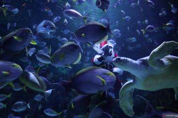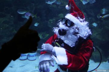 Seorang penyelam yang berpakaian ala Sinterklas berada di kolam ikan, di Aquaria KLCC, Kuala Lumpur, Malaysia, Sabtu (14/12/2019). ANTARA FOTO/Reuters-Lim Huey Teng/hp.
