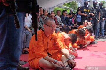 Petugas Bea Cukai menggelar barang bukti dan enam tersangka yaitu warga negara Swiss berinisial RH (kiri), warga Chile PMVV (kedua kiri), warga Thailand PK (ketiga kiri), warga Singapura RTEY (keempat kiri), warga Hongkong PKH (kanan) dan MCK (kedua kanan) dalam konferensi pers kasus upaya penyelundupan narkotika di Kantor Bea Cukai Ngurah Rai, Badung, Bali, Rabu (18/12/2019). Bea Cukai Ngurah Rai berhasil menggagalkan enam upaya penyelundupan narkotika yang dilakukan warga negara asing (WNA) di Bandara Internasional I Gusti Ngurah Rai dari bulan November hingga Desember 2019 dengan barang bukti 30.04 gram ganja milik warga asal Swiss, 20.26 gram ganja milik warga asal Thailand, 0.35 gram kokain milik warga asal Singapura, 77.26 gram methamphetamine milik warga asal Chile, 3.230 gram dan 4.120 gram methamphetamine milik dua warga asal Hongkong. ANTARA FOTO/Nyoman Hendra Wibowo/pras.