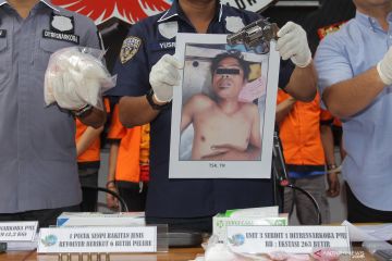 Polisi menunjukkan foto seorang tersangka yang ditindak tegas dan terukut saat rilis pengungkapan narkoba jaringan lapas di Dit Narkoba Polda Metro Jaya, Jakarta, Minggu (22/12/2019). Dit Narkoba Polda Metro Jaya berhasil mengungkap sindikat narkoba jaringan lapas dengan mengamankan 10 orang tersangka, satu orang tersangka ditind dengan tegas terukur serta barang bukti sabu seberat 3,2 kg, ekstasi 263 butir, senjata api rakitan dan 10 kg ganja. ANTARA FOTO/Reno Esnir/wsj.