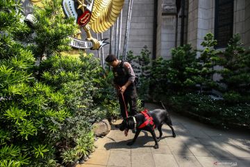 Polisi dibantu anjing pelacak melakukan sterilisasi di Gereja Katedral, Jakarta, Selasa (24/12/2019). Sterilisasi dilakukan untuk memastikan keamanan dan kenyamanan umat kristiani dalam menjalankan ibadah Misa Natal. ANTARA FOTO/Rivan Awal Lingga/foc.