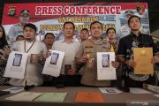 Kapolres Jakarta Utara Kombes Pol Budhi Herdi (kedua kanan) didampingi jajaran menunjukkan barang bukti seusai menyampaikan keterangan pers rilis kasus fintech ilegal di Polres Jakarta Utara, Jumat (27/12/2019). Polres Metro Jakarta Utara berhasil mengungkap tidak kejahatan fintech ilegal yang dilakukan oleh PT Vega Data dan PT Barracuda yang mengelola dua aplikasi Toko Tunai dan KasCash serta menetapkan lima orang tersangka dengan total nasabah yang meminjam di KasCash mencapai 17.650 orang dan Toko Tunai 84.785 orang. ANTARA FOTO/Dhemas Reviyanto/ama.