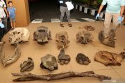 Seorang anak melihat petugas Balai Konservasi Sumber Daya Alam (BKSDA) Aceh dan personil Reskrim Polres Aceh Jaya melakukan identifikasi tulang-tulang gajah sumatra (Elephas maximus sumatranus) di Mapolres Aceh Jaya, Aceh, Kamis (2/1/2020). Tim BKSDA Aceh dan Polres Aceh Jaya menemukan lima bangkai gajah sumatra yang tersisa tulang belulang di kawasan perkebunan sawit di Desa Tuwi Priya Kecamatan Pasie Raya Kabupaten Aceh Jaya yang diduga mati akibat terkena arus tegangan tinggi. ANTARA FOTO/Irwansyah Putra/foc.