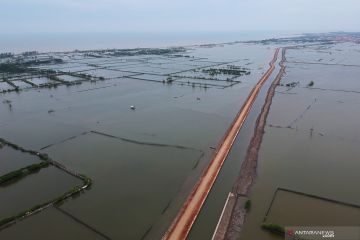 Foto udara tanggul rob di Pekalongan, Jawa Tengah, Jumat (3/1/2020). Berdasarkan data Balai Besar Wilayah Sungai (BBWS) Pemali Juwana, tanggul raksasa pengendali banjir dan rob yang terdiri dari tiga paket yang masing-masing terdiri dari tanggul rob, rumah pompa, dan bangunan penahan air yang berfungsi menyimpan air di dalam sungai atau 'long storage' tersebut sudah berfungsi 100 persen. ANTARA FOTO/Harviyan Perdana Putra/pras.
