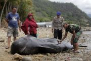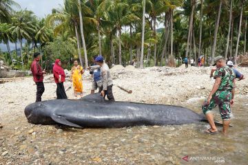 Sejumlah warga bersama anggota TNI dan Polri melihat bangkai paus pilot di pesisir pantai Desa Tolotio, Kabupaten Bone Bolango, Gorontalo, Sabtu (4/1/2020). Menurut keterangan warga setempat, paus pilot dengan panjang sekitar lima meter tersebut sempat berenang di tepian pantai sebelum akhirnya terdampar dan mati akibat air laut surut. ANTARA FOTO/Adiwinata Solihin/wsj.