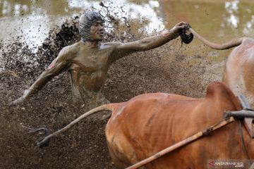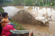 Seorang joki memacu sapinya saat digelar atraksi Pacu Jawi, di Nagari Sungai Tarab, Kabupaten Tanah Datar, Sumatera Barat, Sabtu (4/1/2020). Tradisi Pacu Jawi yang digelar usai panen padi sebagai ungkapan rasa syukur dan suka cita itu, kembali diadakan pada awal tahun 2020 dan akan rutin dibuka setiap bulan untuk masyarakat dan wisatawan.ANTARA FOTO/Iggoy el Fitra/foc.