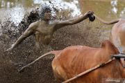 Seorang joki memacu sapinya saat digelar atraksi Pacu Jawi, di Nagari Sungai Tarab, Kab.Tanah Datar, Sumatera Barat, Sabtu (4/1/2020). Tradisi Pacu Jawi yang digelar usai panen padi sebagai ungkapan rasa syukur dan suka cita itu, kembali diadakan pada awal tahun 2020 dan akan rutin dibuka setiap bulan untuk masyarakat dan wisatawan. ANTARA FOTO/Iggoy el Fitra/pras.