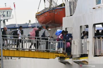 Penumpang pejalan kaki tujuan puau Jawa memasuki kapal Roro di Pelabuhan Bakauheni Lampung Selatan, Lampung, Minggu (5/1/2020). Penumpang pejalan kaki dari berbagai daerah di Sumatera secara bertahap kembali ke pulau Jawa karena akan mulai kerja dan sekolah pada hari Senin (6/1/2020). ANTARA FOTO/Ardiansyah/ama.