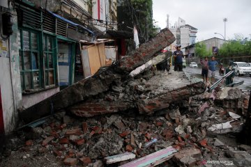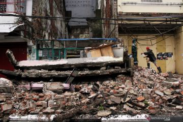 Warga melihat reruntuhan bangunan yang roboh di Makassar, Sulawesi Selatan, Minggu (5/1/2020). Bangunan tua itu roboh akibat struktur bangunannya sudah keropos dan menimpa kios di depannya. Tidak ada korban jiwa dari kejadian tersebut. ANTARA FOTO/Arnas Padda/aww.