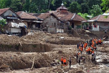 Sejumlah anggota Basarnas, TNI dan Polri melakukan pencarian korban tanah longsor di Kampung Sinar Harapan, Desa Harkat Jaya, Kecamatan Sukajaya, Kabupaten Bogor, Jawa Barat, Selasa (7/1/2020). Memasuki hari keenam pencarian, petugas gabungan masih belum dapat menemukan tiga korban tanah longsor di kampung tersebut karena medan yang berat dan labilnya tanah menjadi kendala yang membuat para petugas harus melakukan evakuasi secara manual. ANTARA FOTO/Arif Firmansyah/ama.