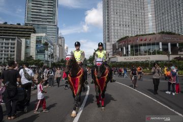 Polisi berkuda berpatroli saat Hari Bebas Kendaraan Bermotor (HBKB) di kawasan Bundaran HI, Jakarta, Minggu (12/1/2020). Patroli tersebut untuk menjaga keamanaan saat pelaksanaan HBKB. ANTARA FOTO/Dhemas Reviyanto/ama.