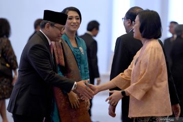 Menteri Keuangan Sri Mulyani (kanan) memberikan ucapan kepada anggota Dewan Komisioner OJK Ex-Officio Kementerian Keuangan Suahasil Nazara (kiri) usai pengucapan sumpah jabatan di Mahkamah Konstitusi, Jakarta, Senin (13/1/2020). Suahasil menggantikan Wamenkeu sebelumnya, yakni Mardiasmo yang masa jabatannya habis tahun lalu. ANTARA FOTO/Puspa Perwitasari/pras.