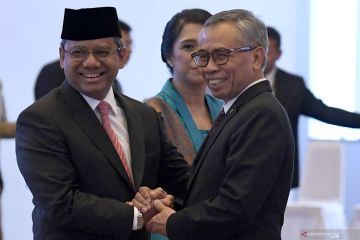 Ketua Dewan Komisioner Otoritas Jasa Keuangan (OJK) Wimboh Santoso (kanan) memberikan ucapan kepada anggota Dewan Komisioner OJK Ex-Officio Kementerian Keuangan Suahasil Nazara (kiri) usai pengucapan sumpah jabatan di Mahkamah Konstitusi, Jakarta, Senin (13/1/2020). Suahasil menggantikan Wamenkeu sebelumnya, yakni Mardiasmo yang masa jabatannya habis tahun lalu. ANTARA FOTO/Puspa Perwitasari/pras.