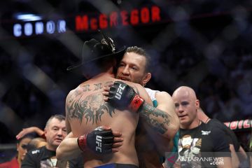 Petarung MMA Conor McGregor memeluk lawannya, Donald Cerrone seusai pertarungan kelas welter UFC 246 di T-Mobile Arena, Las Vegas, Amerika Serikat, Sabtu (18/1/2020). Connor McGregor mempecundangi lawannya Donald Cerrone dalam waktu 40 detik dengan TKO. ANTARA/AFP/Steve Marcus/aa.
