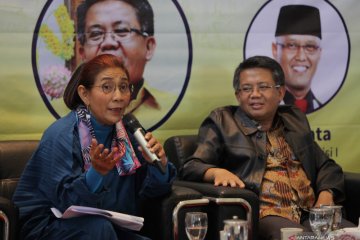 Mantan Menteri Kelautan dan Perikanan Susi Pudjiastuti (kiri) didampingi Presiden Partai Keadilan Sejahtera ( PKS) Sohibul Iman (kanan) memberi penjelasan saat diskusi Ngopi Bareng Presiden PKS di Jakarta, Senin (20/1/2020). Diskusi tersebut mengangkat tema Sengketa Natuna dan Kebijakan Kelautan. ANTARA FOTO/Reno Esnir/hp.