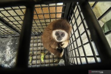 Seekor Owa Sumatra (Hylobates agilis) yang diserahkan warga berada di kandang Balai Konservasi Sumber Daya Alam (BKSDA), Lhokseumawe, Aceh, Senin (20/1/2020). Indonesia memiliki tujuh jenis owa dari 19 jenis di kawasan Asia yang populasinya semakin terancam punah akibat diburu dan kerusakan hutan. ANTARA FOTO/Rahmad/hp.