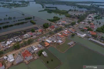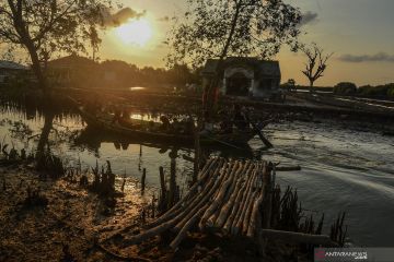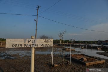 Foto udara sejumlah permukiman yang terendam air laut akibat terdampak abrasi di Kampung Beting, Desa Pantai Bahagia, Kecamatan Muara Gembong, Kabupaten Bekasi, Jawa Barat. Di permukiman itu sebelumnya dihuni ratusan kepala keluarga (KK). Namun, sejak 12 tahun silam rumah-rumah tersebut tenggelam akibat abrasi. ANTARA FOTO/Adeng Bustomi/pras.