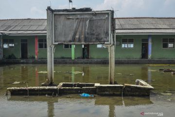 Sekolah Madrasah ibtidaiyah (MI) Mansyaul Huda halaman sekolahnya tergenang air laut akibat terdampak abrasi di Kampung Beting, Desa Pantai Bahagia, Kecamatan Muara Gembong, Kabupaten Bekasi, Jawa Barat. ANTARA FOTO/Adeng Bustomi/pras.