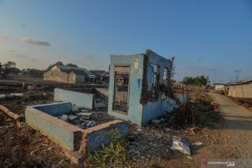 Rumah warga yang rusak dan ditinggal pergi pemiliknya akibat terdampak abrasi di Kampung Beting, Desa Pantai Bahagia, Kecamatan Muara Gembong, Kabupaten Bekasi, Jawa Barat. Ratusan rumah kini tak lagi berpenghuni. Sebagian tenggelam ditelan laut, sebagian lagi dibiarkan kosong dan rusak lantaran cukup lama ditinggal pemiliknya. ANTARA FOTO/Adeng Bustomi/pras.