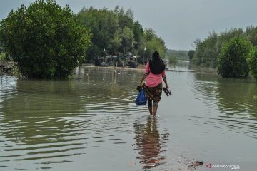 Warga berjalan menerobos luapan air laut yang biasa menggenangi Kampung Beting, Desa Pantai Bahagia, Kecamatan Muara Gembong, Kabupaten Bekasi, Jawa Barat. ANTARA FOTO/Adeng Bustomi/pras.
