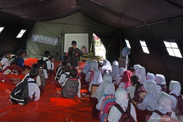 Sejumlah siswa kelas 4 SD Negeri 02 Banjarsari mengikuti proses belajar mengajar di tenda di Kampung Banjarsari, Lebak, Banten, Rabu (22/1/2020). Seluruh siswa sekolah tersebut terpaksa belajar di tenda dan bangunan darurat karena bangunan sekolahnya hancur diterjang banjir bandang 1 Januari lalu. ANTARA FOTO/Asep Fathulrahman/hp.