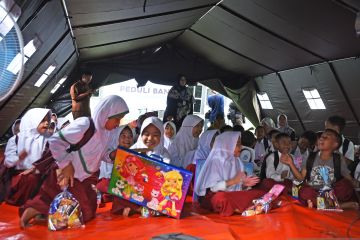 Sejumlah siswa kelas 2 SD Negeri 02 Banjarsari mengikuti proses belajar mengajar di tenda di Kampung Banjarsari, Lebak, Banten, Rabu (22/1/2020). Seluruh siswa sekolah tersebut terpaksa belajar di tenda dan bangunan darurat karena bangunan sekolahnya hancur diterjang banjir bandang 1 Januari lalu. ANTARA FOTO/Asep Fathulrahman/hp.