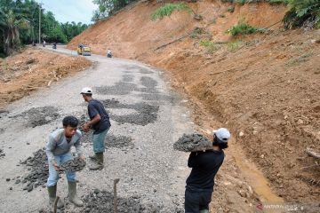 Pekerja Dinas Bina Marga dan Pengairan Kabupaten Bogor melakukan perbaikan infrastruktur jalan pascabencana tanah longsor di ruas jalan utama Cigudeg-Sukajaya, Kabupaten Bogor, Jawa Barat, Rabu (22/1/2020). Badan Penanggulangan Bencana Daerah (BPBD) Kabupaten Bogor menyatakan dibutuhkan waktu setahun untuk memperbaiki infrastruktur jalan, fasilitas umum, dan permukiman warga dampak bencana banjir bandang dan tanah longsor di Kabupaten Bogor. ANTARA FOTO/Arif Firmansyah/pras.