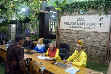 Petugas memberikan pelayanan kepada warga di Mall Pelayanan, Kantor Dinas Penanaman Modal Perizinan dan Pelayanan Terpadu (DPMPPT), Kabupaten Batang, Jawa Tengah, Kamis (23/1/2020). Pemerintah Kabupaten Batang berinovasi membuat Mall Pelayanan Publik dengan konsep hutan di dalam ruangan yang memberikan 329 pelayanan publik yang terintegrasi sehingga dapat memudahkan warga dalam mengurus segala administrasi publik. ANTARA FOTO/Harviyan Perdana Putra/pras.