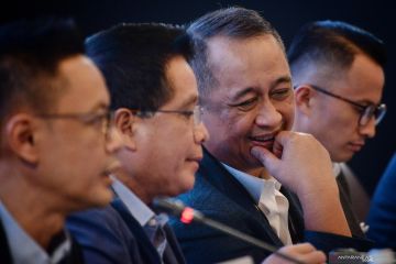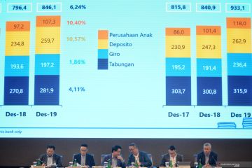 Direktur Utama Bank Mandiri Royke Tumilaar (kedua kanan) didampingi Direktur Consumer & Retail Transaction Hery Gunardi (kedua kiri), Direktur Manajemen Risiko Ahmad Siddik Badruddin (kiri), dan Pejabat Eksekutif Keuangan dan Strategi Silvano Rumantir (kanan) menyampaikan paparan kinerja Bank Mandiri triwulan IV-2019 di Jakarta, Jumat (24/1/2020). Bank Mandiri berhasil mencetak laba bersih Rp27,5 triliun pada triwulan IV-2019, tumbuh 9,9 persen dari akhir tahun sebelumnya, yang didukung oleh pertumbuhan kredit konsolidasi sebesar 10,7 persen YoY hingga mencapai Rp907,5 triliun dan perseroan berhasil mencatat pendapatan bunga bersih sebesar Rp59,4 triliun, naik 8,8 persen YoY dibanding tahun sebelumnya. ANTARA FOTO/Aprillio Akbar/hp.
