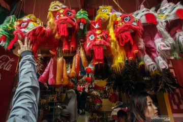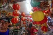 Pengunjung memilih pernak-pernik imlek yang dijual di Kampung Cina Kota Wisata Cibubur, Bogor, Jawa Barat, Sabtu (25/1/2020). Menurut pedagang, pada perayaan Tahun Baru Imlek penjualan aksesoris imlek yang dijual Rp5.000 - Rp500.000 tersebut meningkat hingga lima kali lipat dibandingkan hari biasa. ANTARA FOTO/Yulius Satria Wijaya/ama.