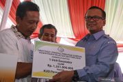 Menteri Kelautan dan Perikanan (KKP) Edhy Prabowo (kanan) menyerahkan bantuan kepada perwakilan nelayan di Palembang, Sumatera Selatan, Senin (27/1/2020). Dalam kunjungan kerja tersebut Menteri KKP menyerahkan bantuan pemerintah kepada nelayan. ANTARA FOTO/Nova Wahyudi/hp.
