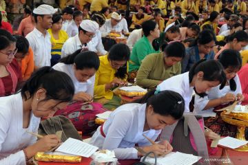 Peserta menuliskan aksara Bali di atas daun lontar dalam festival "Nyurat Lontar" yaitu rangkaian peringatan Bulan Bahasa Bali 2020 di Taman Budaya Bali, Denpasar, Bali, Sabtu (1/2/2020). Kegiatan yang diikuti 2.020 peserta tersebut merupakan upaya perlindungan dan penggunaan bahasa, aksara serta sastra Bali. ANTARA FOTO/Nyoman Hendra Wibowo/nym/hp.