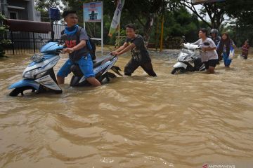Warga pejalan kaki dan pengendara sepeda motor melintasi banjir di Walantaka, Serang, Banten, Sabtu (1/2/2020). Banjir terjadi akibat tanggul di lokasi tersebut jebol setelah diguyur hujan sejak Jumat (31/1) malam. ANTARA FOTO/Asep Fathulrahman/ama.