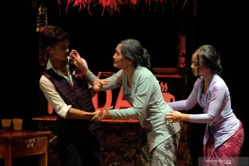 Sejumlah siswa menampilkan teater berjudul "Katemu Ring Tampaksiring" dalam pagelaran seni sastra serangkaian peringatan Bulan Bahasa Bali 2020 di Taman Budaya Bali, Denpasar, Bali, Minggu (2/2/2020). Kegiatan yang digelar pada 1 - 27 Februari 2020 tersebut menampilkan berbagai perlombaan, lokakarya, diskusi, pameran dan pagelaran seni sastra dengan menggunakan aksara dan bahasa Bali yang diikuti pelajar, perguruan tinggi, organisasi bahasa serta perajin. ANTARA FOTO/Nyoman Hendra Wibowo/aww.